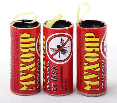 Липкая лента от мух с добавлением мёда (с аттрактантами). Состав: каучук, производные полиизобутилена, масло минеральное.